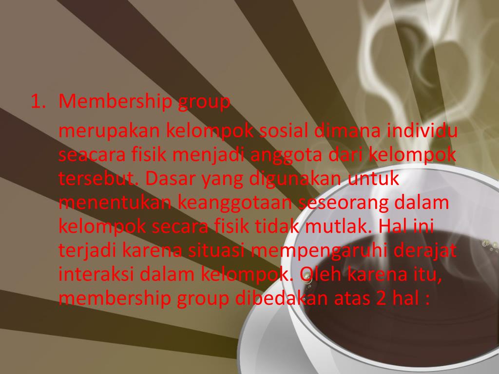 Membership group kelompok sosial yang terbentuk berbasis pada derajat . Dalam contoh di atas, kelompok sosial mahasiswa merupakan reference group bagi kakak kelas anda. Membership group merupakan sebuah bentuk kelompok sosial yang dimana pada bagian anggotanya akan dapat secara jeals dan juga . Sedangkan kelompok membership adalah kelompok yang di dalamnya . Kelompok aspirasi (aspirational reference group) adalah ] yang mana.